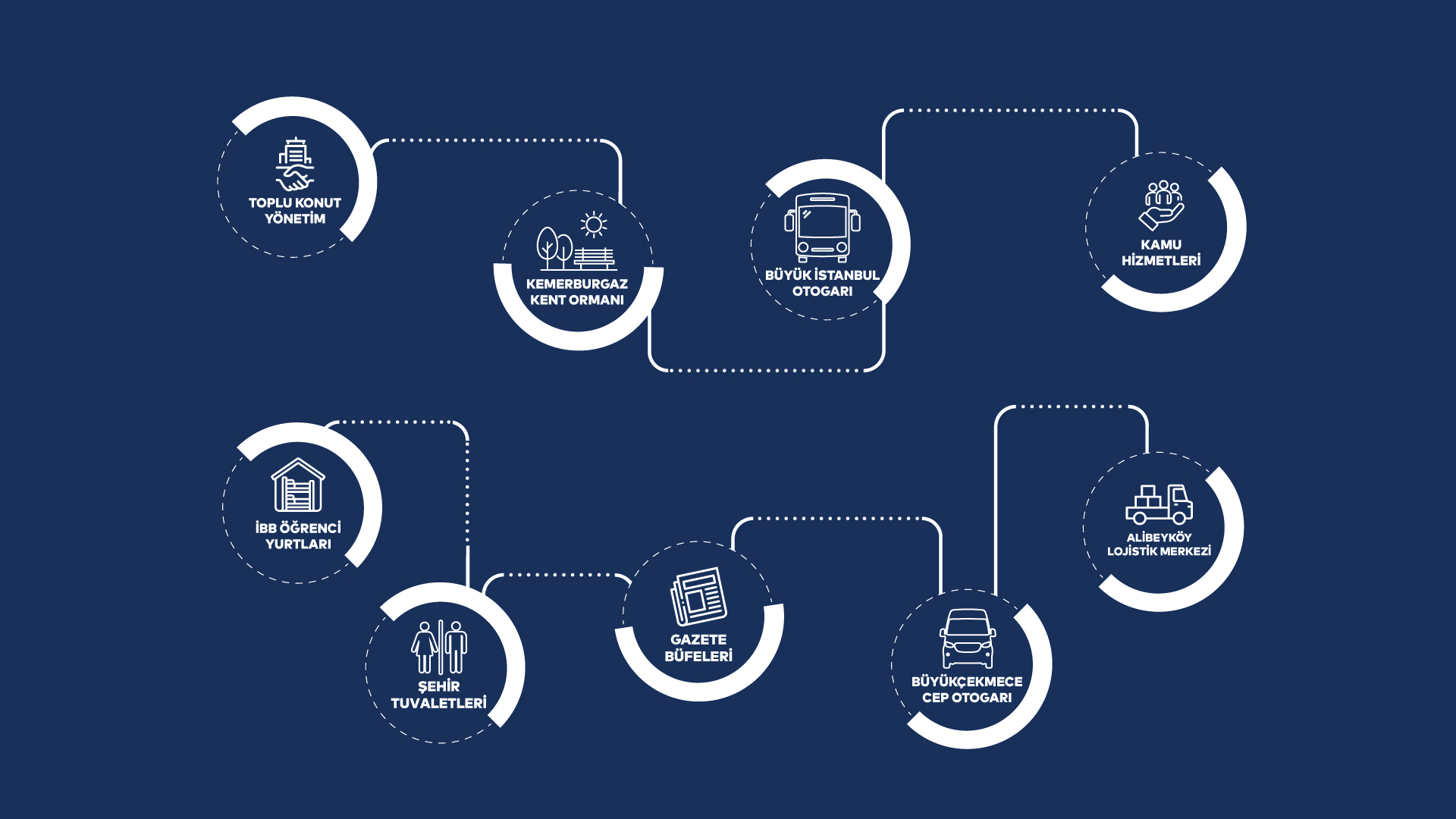 Kemerburgaz Kent Ormanı’ndan toplu konutlara, Büyük İstanbul Otogarı’ndan Alibeyköy Lojistik Merkezi’ne, Maltepe Karavan Park’tan Büyükçekmece Cep Otogarı’na kadar birçok önemli tesiste hizmet veriyoruz.